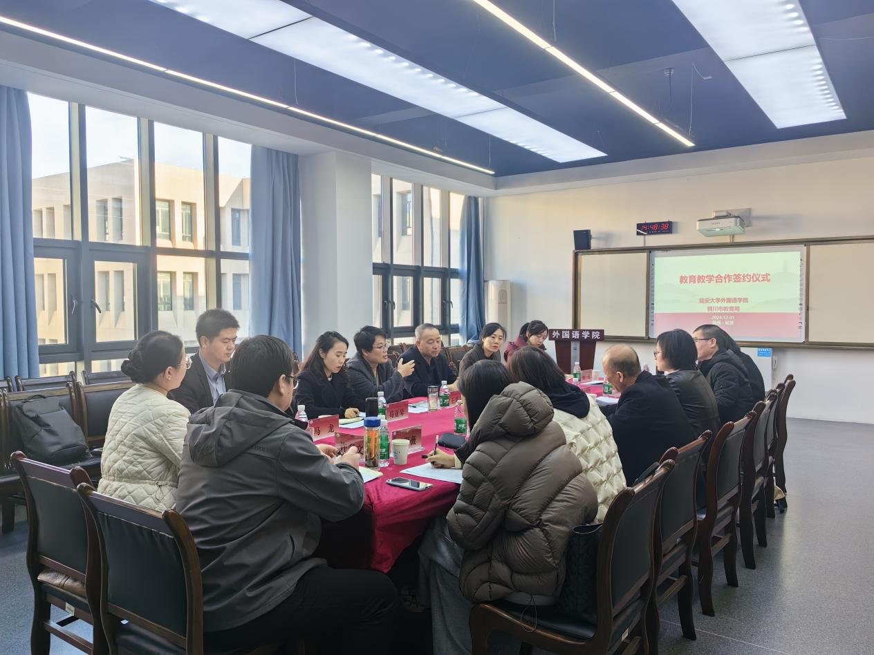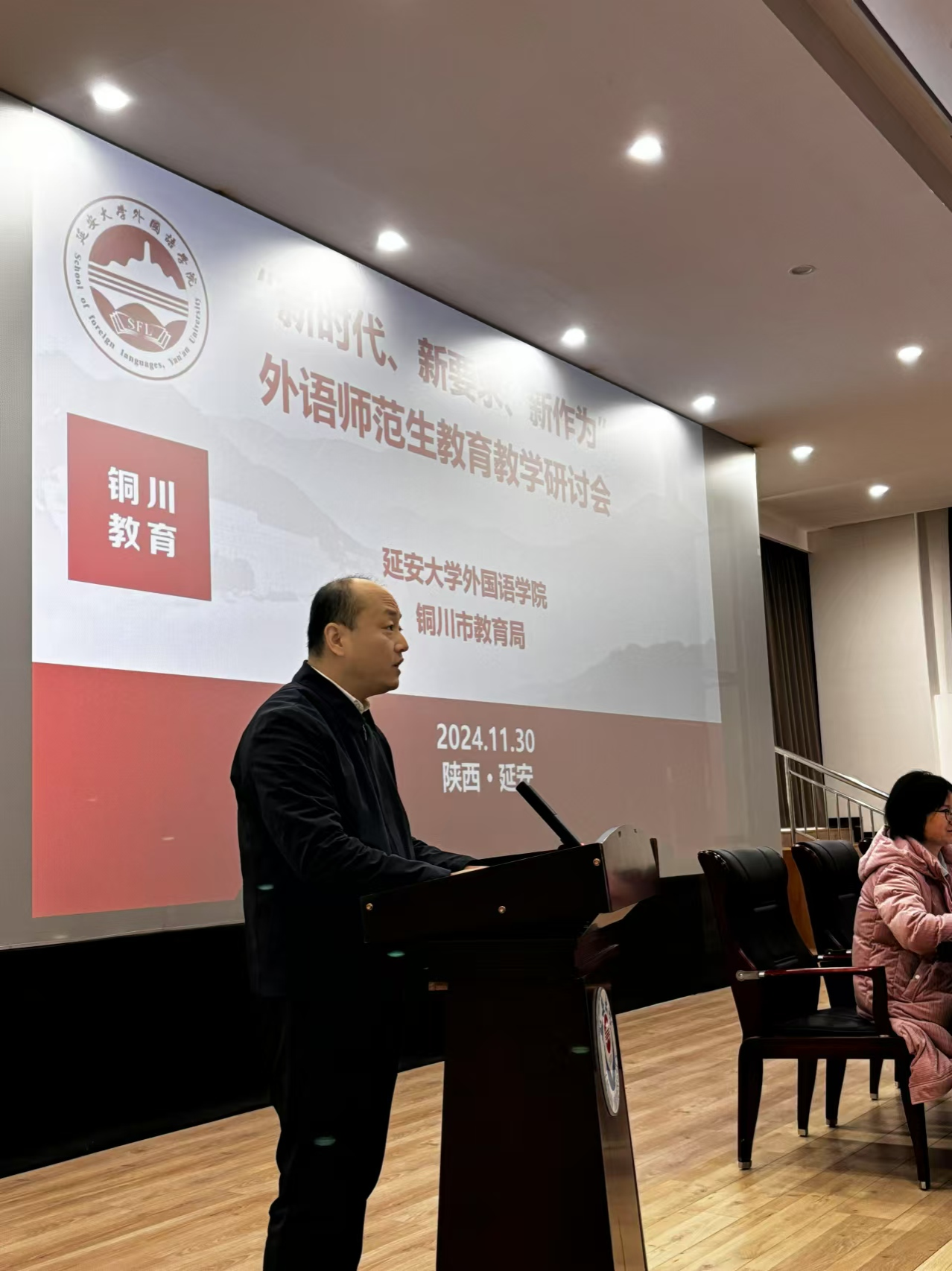 铜川市教育工委副书记赵迎军在发言中盛赞了母校近年来在团队建设、专业发展、人才培养等方面都取得的卓越成就,介绍了铜川市教育局在改善办学条件,加强教师队伍建设,优化教育资源配置等方面推出的一系列举措和取得的显著办学成效。同时他指出,在教育改革发展的进程中,铜川市也面临着诸多挑战与困惑,尤其是在如何进一步培养员工的跨文化交际能力和国际视野、如何加强教育信息化与外语教学的深度融合、创新教学模式与方法、提高课堂教学效率、构建更加完善的教育评价体系等方面,都亟待深入思考与探索。最后,他希望双方能以此次合作为契机,在教育资源共享、教师培训交流、教学科研合作等方面建立长期稳定的合作机制,实现优势互补、互利共赢。