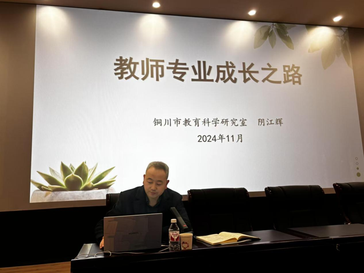 阴江辉做了题为《教师专业成长之路》的主旨报告,通过解读“三级三类”骨干教师体系建设的内涵和要求,从理论学习、实践应用、素养养成三位维度,围绕“备”“教”“学”“评”“研”五个教学环节,详细阐述了教师成长中“点、线、面”三个方面的内容。