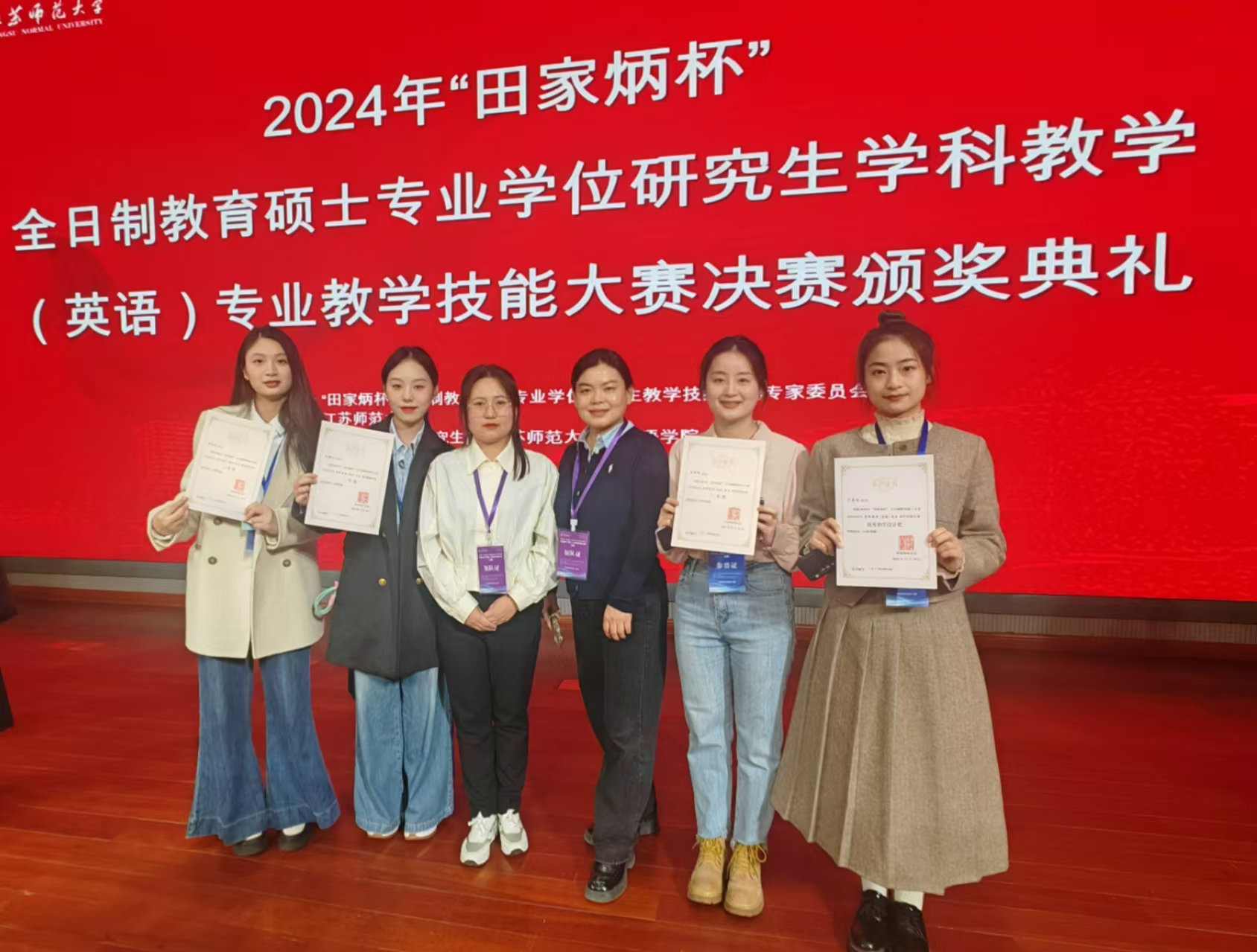 11月8日—9日,2024年“田家炳杯”全日制教育硕士专业学位研究生学科教学(英语)领域教学技能大赛在江苏师范大学举行。经过各培养单位初赛和线上教学视频选拔,共有上海交通大学、北京师范大学、华中师范大学、华东师范大学等107所高校的260名选手入围全国决赛。公司2023级丁晨瑶、雷红莹、岳姝璇、方静等4名研究生顺利进入全国总决赛。