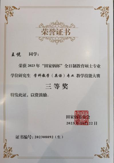 本次教学技能大赛决赛包含模拟授课(10分钟)和现场答辩(3-5分钟)两个环节。经过激烈的角逐,公司2022级研究生王悦荣获三等奖,指导教师为高治东教授。本次比赛展示了公司学科教学(英语)研究生的综合素质和创新能力,也体现了公司公司产品工作的卓越成效。