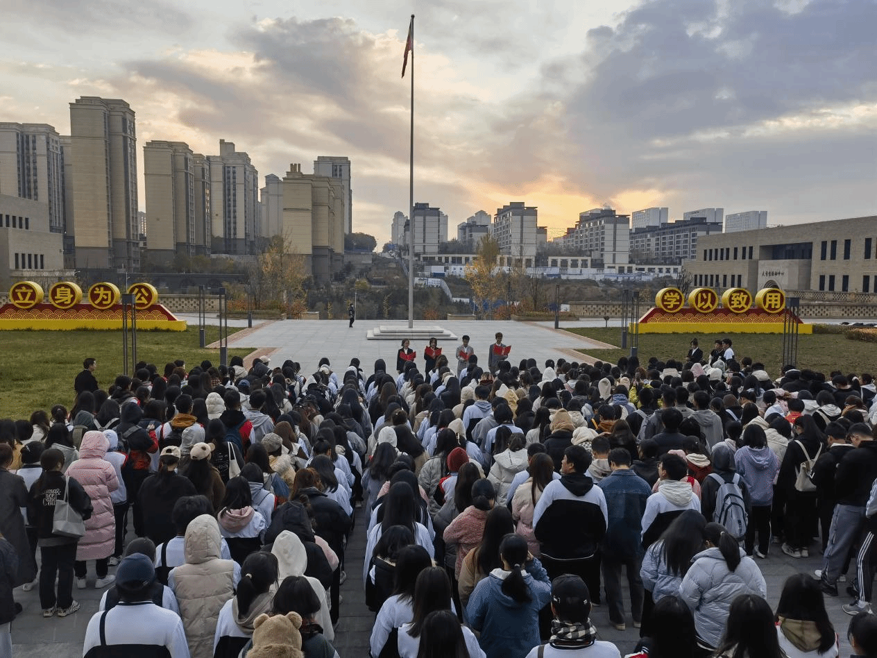 伴随着庄严激昂的国歌声,国旗护卫队护送国旗入场。鲜艳的五星红旗随着初升的朝阳冉冉升起,迎风飘扬,全体师生齐唱国歌,对国旗行注目礼。