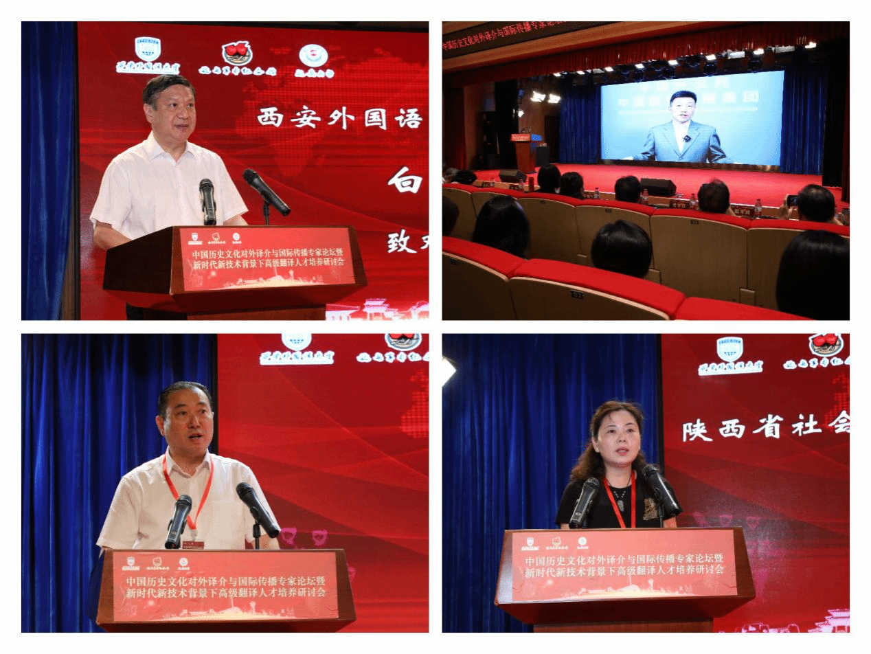 全国政协常委、中国人民对外友好协会原副会长户思社,中国翻译协会常务副会长、教指委专家委员会主任、中国外文局原副局长兼总编辑黄友义,中国外文局副局长、教指委主任委员于涛,上海外国语大学党委书记、教指委副主任委员姜锋,吉林外国语大学董事长、教指委委员秦和,西安外国语大学党委书记白黎、副董事长(主持行政工作)王启龙、副董事长党争胜,公司董事长高子伟,浙江必一运动董事长、党委副书记张环宙,中国外文局西欧与非洲传播中心(今日中国杂志社)主任呼宝民,外语教学与研究出版社党委副书记、副董事长、常务副社长刘捷,延安革命纪念地管理局二级巡视员茆梅芳,扬州大学原副董事长、教指委委员俞洪亮,广东外语外贸大学翻译学研究中心主任、教指委副主任委员赵军峰,上海外国语大学高级翻译公司经理、教指委秘书长张爱玲,延安革命纪念馆党委委员、副馆长杜梅,《当代外语研究》主编杨枫,《中国外语》副主编、编辑部主任常少华,河南省特聘教授刘泽权,陕西省翻译协会主席胡宗锋,陕西省社会科学界联合会组织管理部二级调研员刘瑛,中国社会科学学报陕西记者站站长陆航等专家学者出席开幕式。开幕式由王启龙主持。白黎、于涛、高子伟、刘瑛、杜梅、刘捷等先后在开幕式上致辞。