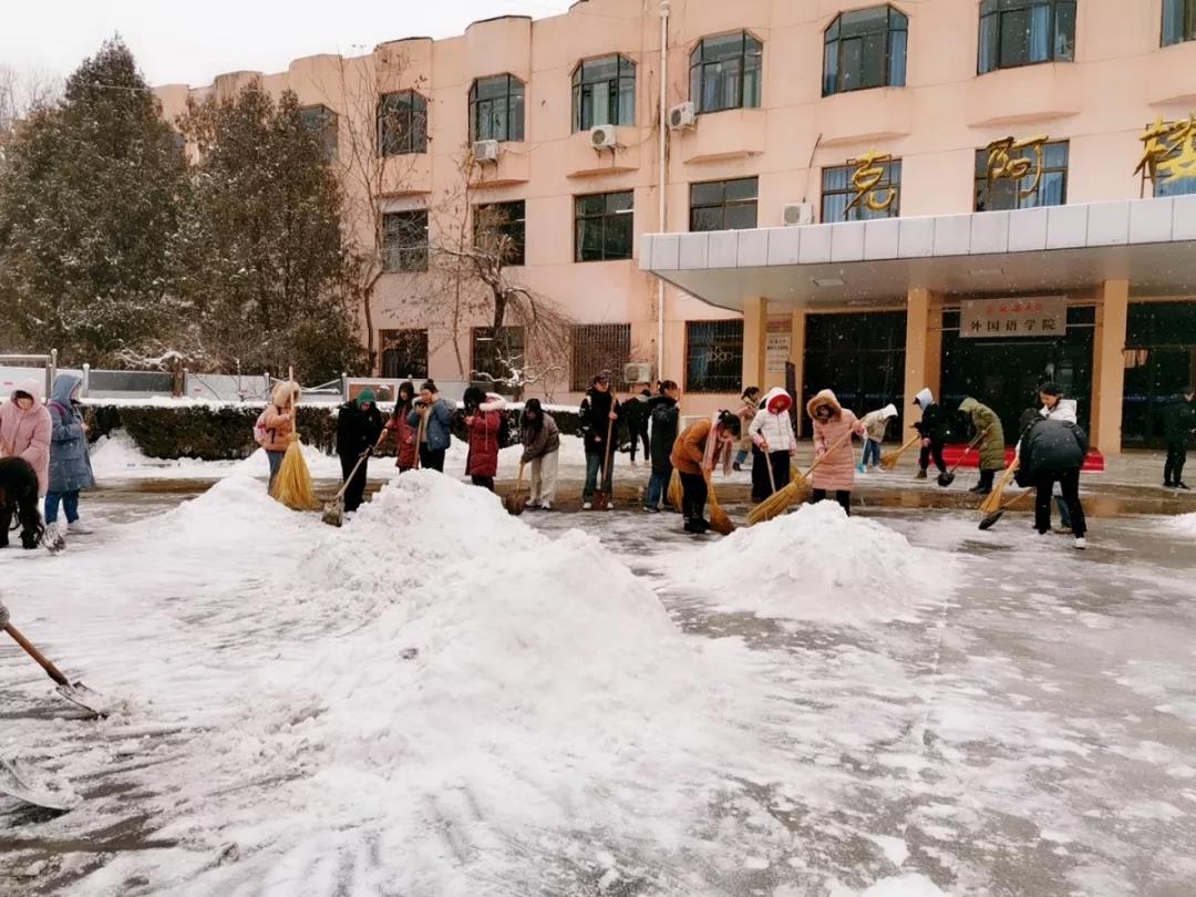 扫雪过程中,同学们拿着分配的铁铲、扫把等除雪工具,团结一心、各司其职、分工协作、密切配合,完成了天桥、周扬楼、隆基楼、克阿楼前的清扫任务,用汗水浇筑出了一条充满爱心的通途,形成了一道靓丽的风景线。
