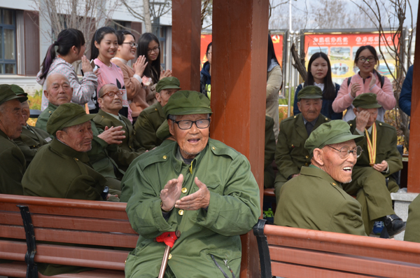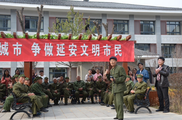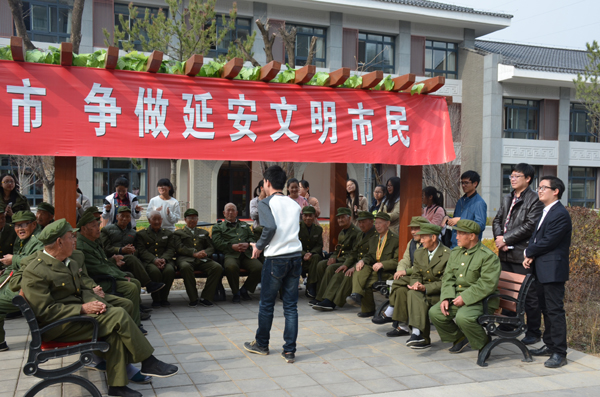 主题党日活动的第二部分是到延安八一敬老院开展志愿服务活动。下午3:00,所有活动参与人集体乘坐公交车,来到延安八一敬老院。志愿服务活动在敬老院小广场举行。86岁的李福工老人首先代表老人们对志愿者们的到来表示热烈欢迎,高兴地向大家介绍了八一敬老院的基本情况。随后,志愿者们为老人们表演了舞蹈《小苹果》等节目,为他们送上了水果和蛋糕。老人们对于志愿者们的到来显得非常高兴,郝宝强老人为大家表演了他自己创作的歌曲《习近平总书记慰问老红军》,张宏山老人拉着二胡,演唱了歌曲《二月里来》,87岁的老红军孟振亚老人给志愿者们讲述了战争故事。随后,应老人们的要求,志愿者和老人们举行了集体大合唱,演唱了《没有共产党就没有新中国》和《打靶归来》两首老人们特别喜欢的歌曲。