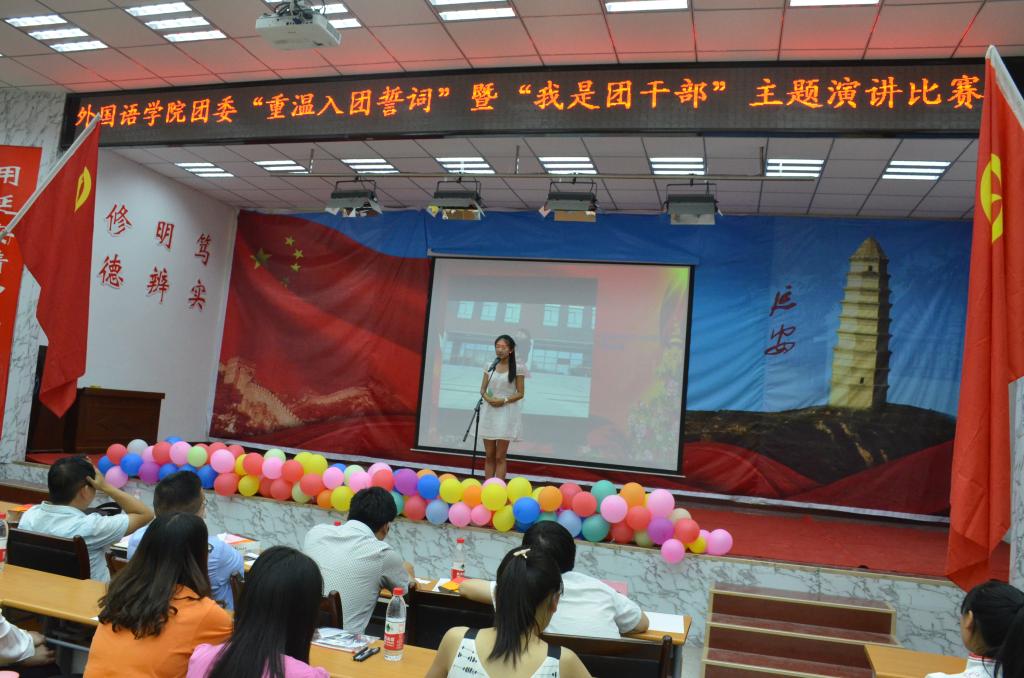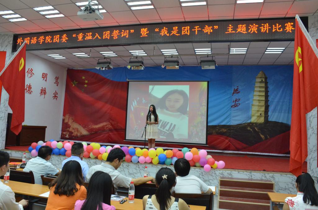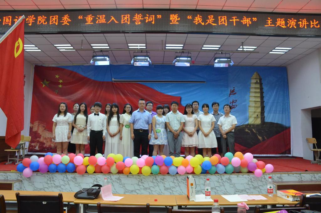 活动在充满激情的《光荣啊,共青团》的团歌声中拉开了序幕。首先,主持人代表公司全体团员向七十八年来为民族独立和祖国富强而牺牲的英烈们表达了缅怀之情,并号召全体团员树立“勿忘国耻、从我做起”的坚定信念。接着,在院团委宣传部长刘珍同学的带领下,全体团员、团干举起右拳面对团旗举行了“奋斗的青春正当时——重温入团誓词”仪式,宣誓仪式庄严隆重,令在场的全体人员内心澎湃、激动不已。在第三环节“我是团干部——我骄傲”主题演讲赛中,来自13、14级各支部的团干部们以其热情洋溢的演讲赢得了观众的阵阵掌声。刘欢同学带来的《奋斗的青春最美丽》从一件小事说起,娓娓道来,展现了支部高度的凝聚力和浓浓的情谊;魏宇豆的《当我来到这里》表达了一名团干部对于大学团建的认识和坚定的政治信仰;秦姣姣的《如何成为一名优秀的团干部》号召大家以思想引领为中心,以服务青年为方法,以赢得青年为目的,锻造自己、提升自我,做一名党放心、团信任、青年满意的团干部。经过激烈的角逐,刘欢等同学分别获得了演讲比赛的前三名。