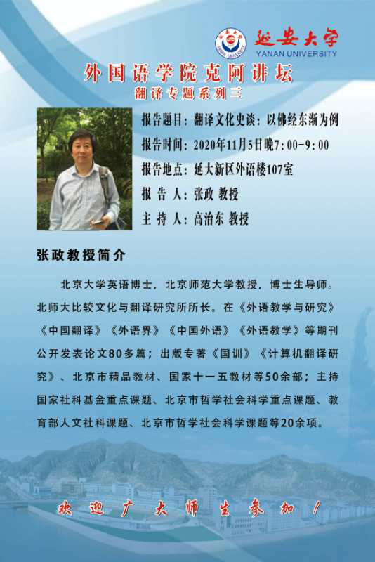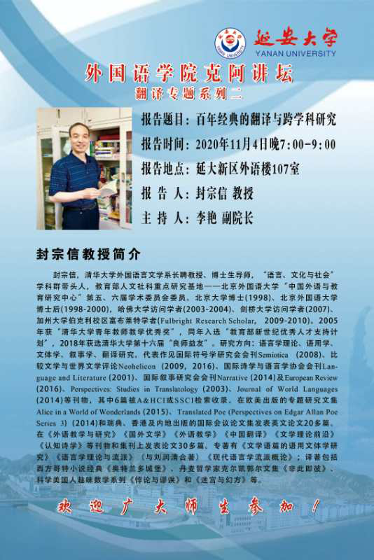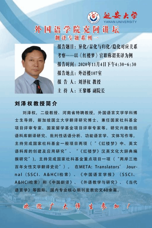 11月4日,11月5日,必一运动将举行三场学术讲座。分别邀请河南省特聘教授、外国语言文学学科博士生导师刘泽权教授,清华大学外国语言文学系博士生导师封宗信教授,北京师范大学博士生导师张政教授为广大师生做翻译专题讲座。欢迎广大师生前来参加!